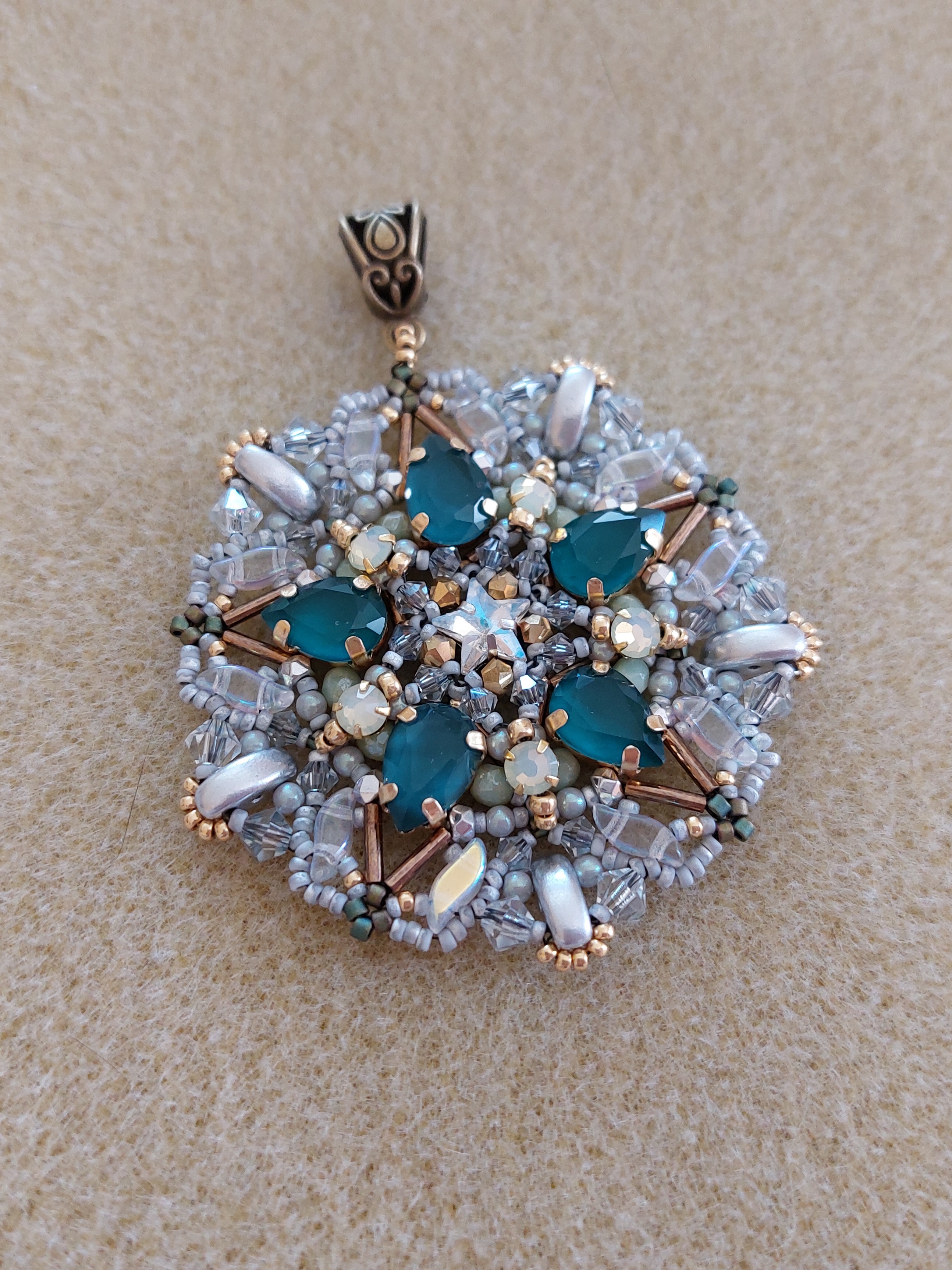 It look me a couple of night to bead this. You can stop and have a beautiful jewel at more than one place in the pattern. The pattern is very well written and easy to follow. I love this pendant 💖 Thank you for creating it Erika!