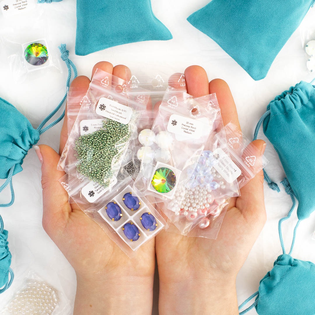 P.P. Turquoise Bag : 10-12 items, including Preciosa Rivoli (that were discontinued recently 😱) and something new that you can’t yet find in the Bead Shop!